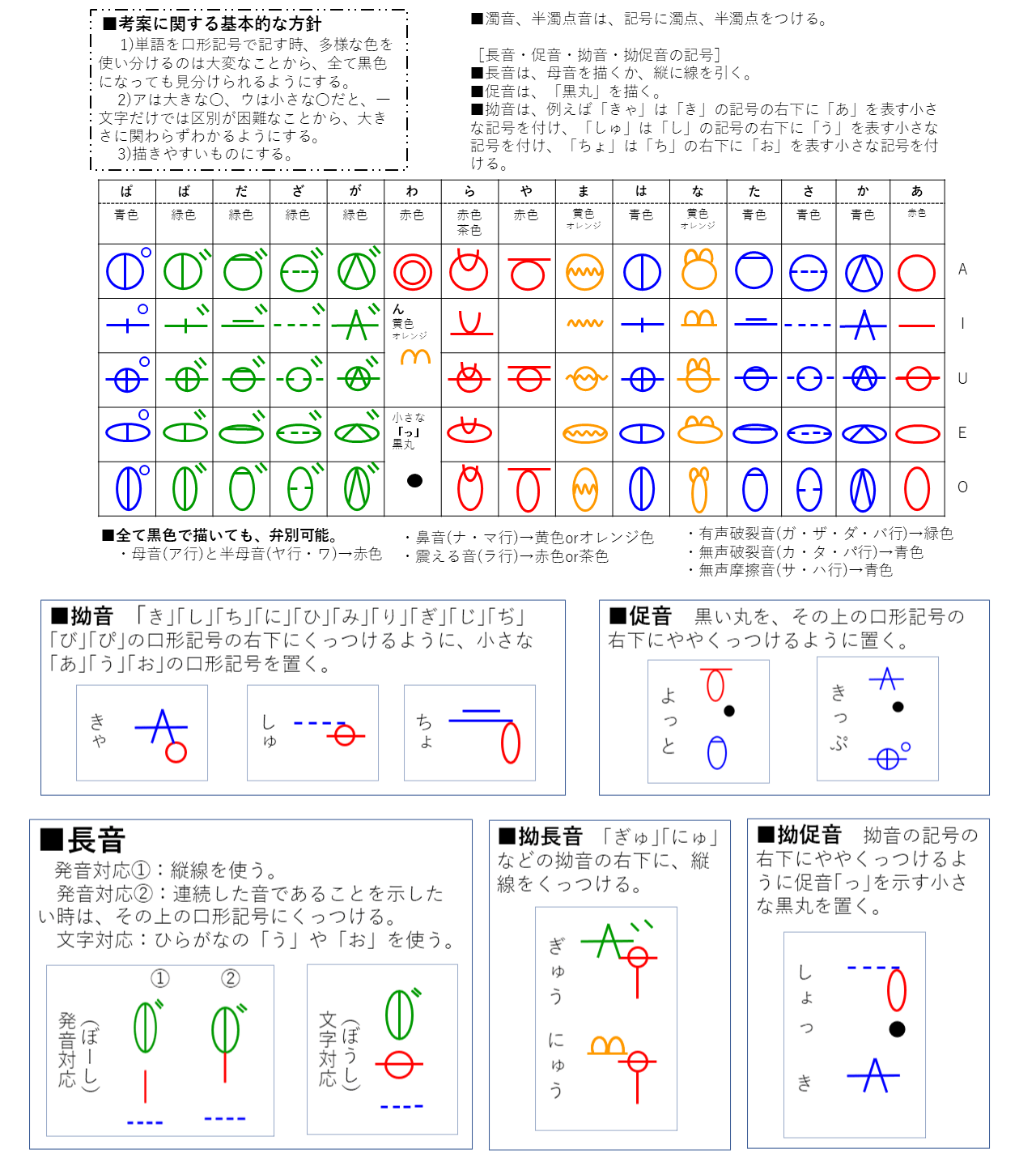 - 戦前から発音指導時に発音要領とひらがなを結びつけるために用いられてきた記号の特徴を活かす。