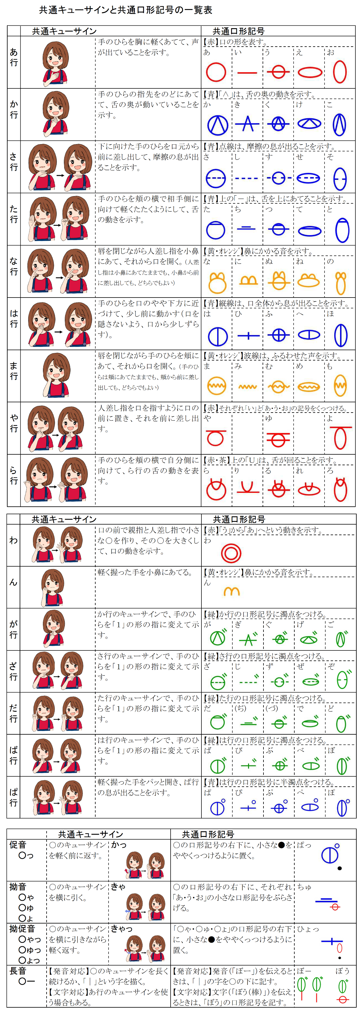 - 聴覚障害児をもつ保護者に知っていただくためです。(人工内耳などによっても日本語が正確に伝わらない場合には、日本語の音韻を視覚的に表す手段が必要です。ひらがなを習得する前の乳幼児でも習得しやすい共通口形記号を紹介します。)